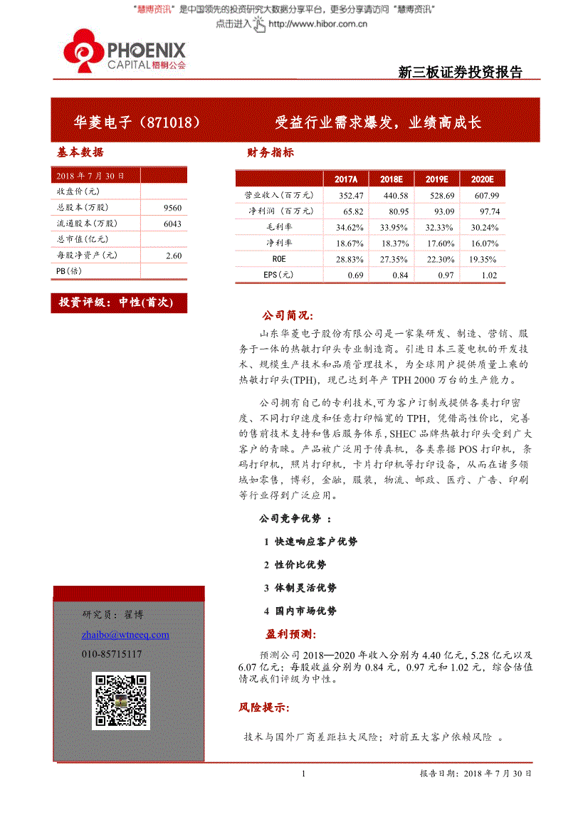 新三板证券投资报告报告日期:2018年7月30日1基本数据2018年7月30日收盘价(元)总股本(万股) 9560流通股本(万股) 6043总市值(亿元)每股净资产(元) 2.60PB(倍)财务指标公司简况:山东华菱电子股份有限公司是一家集研发、制造、营销、服务于一体的热敏打印头专业制造商。